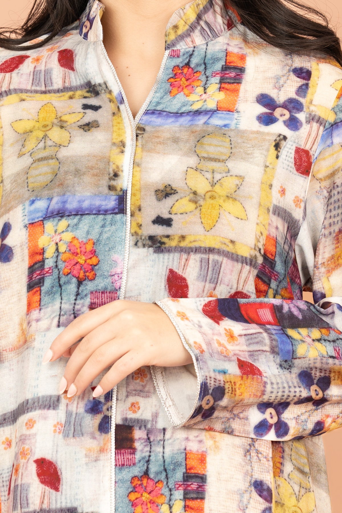 جلابية عصرية نقوش ملونة IK1021 بيج